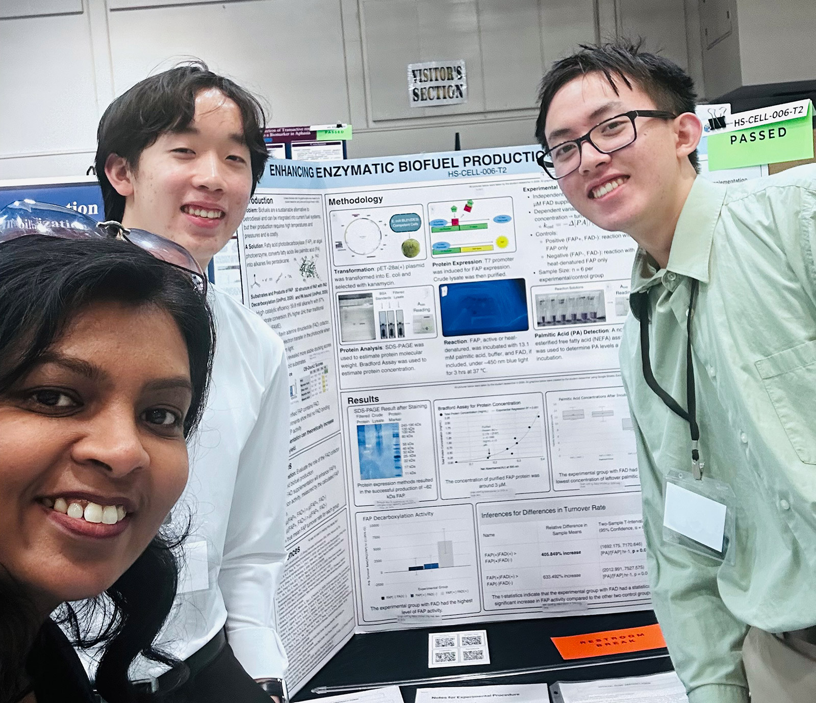 In the cell and molecular biology category, Matthew Du (12th grade) and Daniel Du (11th grade) earned second place for their collaborative project exploring enzymatic biofuel production. Their research focused on improving the efficiency of a specialized protein capable of converting fatty acids—such as those found in waste cooking oil—into hydrocarbons that could be used as fuel.