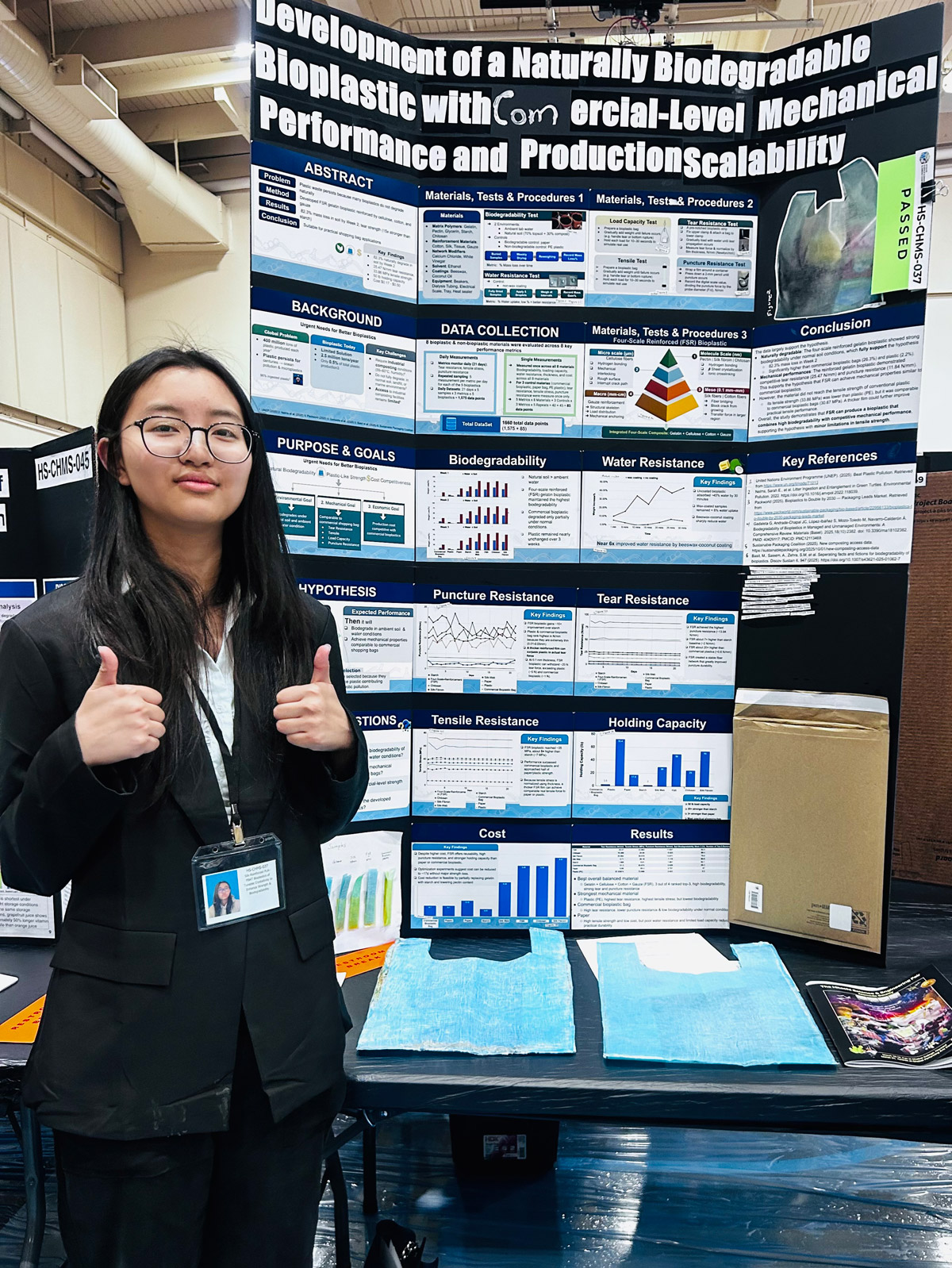 Junior Deija Lin earned third place in the chemistry category for her project focused on developing an environmentally friendly alternative to plastic. Drawing on extensive research, she experimented with multiple bioplastic formulations, combining different approaches to create a material strong enough for everyday use. Her final product—a fully biodegradable plastic bag—demonstrated both practicality and innovation.