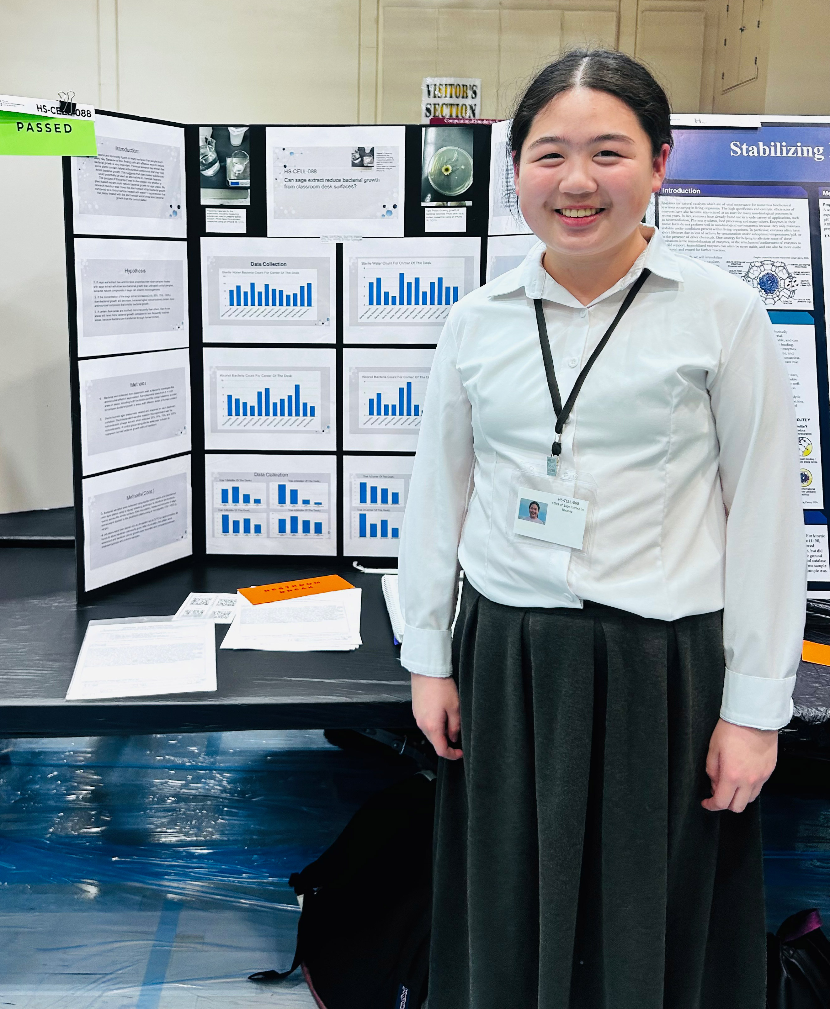 Sophomore Elaine Huang placed fourth in the cell and molecular biology category, with a project examining the antibacterial effects of sage extract on classroom surfaces. By testing different concentrations, she found that higher concentrations were effective in reducing bacterial growth, while lower concentrations showed little impact.
